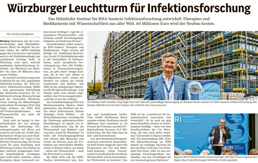 Am 24.09.2025 konnten wir mit politischer Prominenz das Richtfest an unserer Baustelle des Helmholtzinstituts auf dem Campus des Universitätsklinikums Würzburg feiern.
